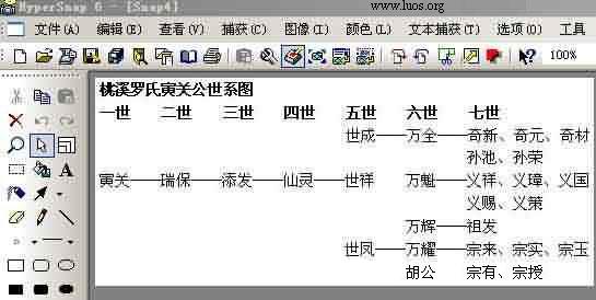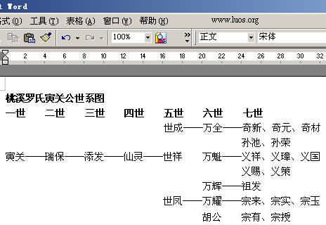作者:罗良富http://www.luos.org 谱牒之作,所以明世系,别亲疏,正根本,序昭穆也。而世系图是家谱中的主体部分,它既直观表达一个家族的世系传承关系,又检验其世系传承关系是否明确──世系没有理清楚,世系图一定画不出来。 世系图以宝塔式图谱的树系图谱和线形图谱(平行图谱)最为常见,现代修谱则因印刷版式的原因更以后者为最。 世系图的制作本质上是图形处理,用一般的文字处理很难画好,故需把握一些图形工具的运用。下面以最常见的线形图谱为例,根据自己的实践,一步步说明用最常见的图形软件,绘制家谱世系图的画法。