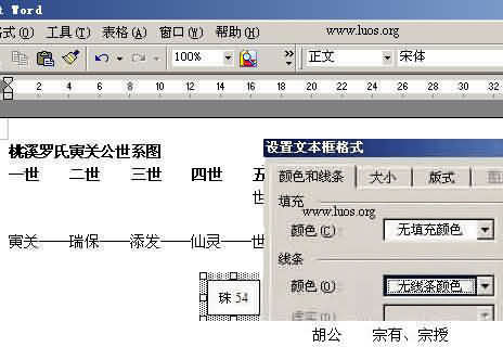 注意:这一步是基础,一定要把上下关系(辈序)弄准确,在保证上下、左右关系清楚前提下,尽可能排列紧凑,以缩小最后形成图片的个头。 难点:当横线上要标明代数等时,要这样做:选择“插入\文本框”,输入文字后,把鼠标指向文本框的边,当鼠标变成十字形黑色箭头的状态下,右击鼠标选择“设置文本框格式”,然后点“颜色和与线条”,在颜色下选“无填充颜色”,在线条下选“无线条颜色”。然后,将文本框放到横线上即成(也可以另做成小图片,最后粘贴上去)。