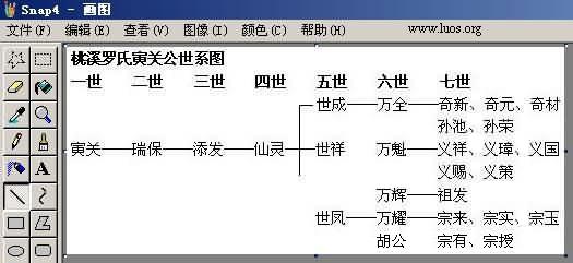 这一步的连线也可以在第一步,用WORD的画直线完成,但远不如Mspaint灵活。 注意:这一步一定要仔细,多核对检查几遍,保证世系传承准确无误。如果有错,没关系,用橡皮檫檫除重画即可。 连线完的图片如下:
