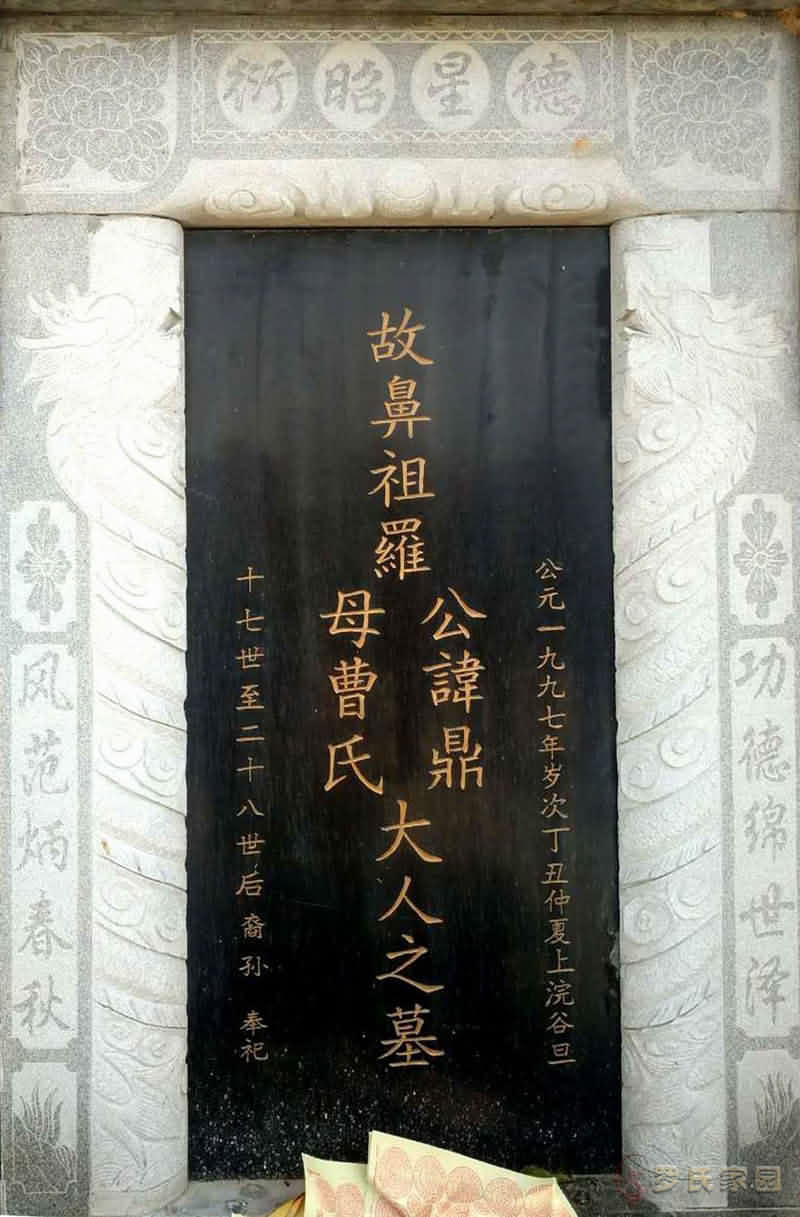 谱载,祖福三公,原籍江西南昌府柏树沟,于明洪武三年(1369),奉旨移民入籍湖北麻城南乡白果西北五里之赤山咀唐家巷。因怀念故士名迁居地为柏树寨。福三公子五:恭(明甫)、宽、崇(权甫)、敏、惠(宗甫)。恭、崇二公居麻城白果及罗田、金寨、固始、福建、四川等地;宽公裔居罗扬马;敏公失传;宗甫公子六:贵一、贵二、贵三、贵四、贵五、贵六。贵一居潘塘罗一冲;贵六居新洲张店街后罗家湾;其余四公散居鄂、豫、皖各省。贵六公(尽心堂)为迁网一世始迁祖。