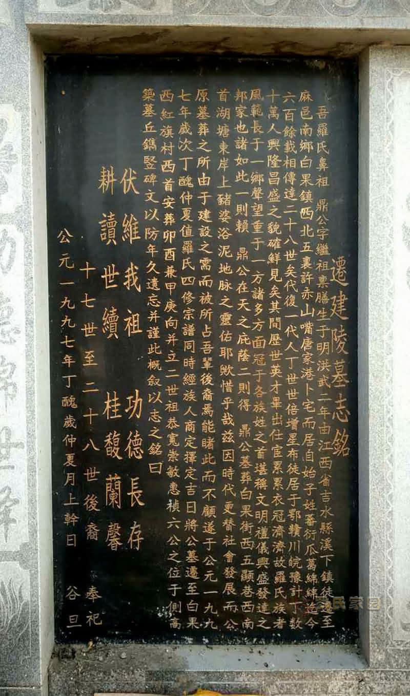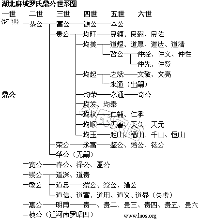 我祖鼎公为一世,生子有五,恭、宽、崇、敏、惠为二世,我恭公生子有四,富、贵、荣、华为三世,我贵公生子有九,均美、均泰、均起、均荣、均财、均发、均权、均顺、均玉。为四世迁居全国各地。均美公迁安徽商邑现金寨为始祖,均起、均荣两公迁湖北罗田义水(现九资河镇)为始祖,均起公居黑狗山,均荣居罗家畈分为两份,起公为上份,荣公为下份,与均美公一岭之隔,以三公支下合修已久,统一同派。以昭亲亲而垂久也。