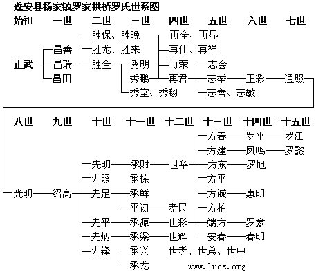 作者:罗小平http://www.luos.org 我四川省蓬安县杨家镇罗家拱桥罗氏一族,据老辈资料,祖籍为一个名为“鹅公大丘”的地方。大起祖正武公生昌瑞。昌瑞生子五:胜全、胜龙、胜来、胜保、胜晚,五人自湖广填川,至西蜀关寨插栈落业顺庆府。胜全生子四:秀明、秀鹏、秀堂、秀翔;秀鹏生子六:再君、再荣、再仕、再祥、再全、再显。再君插业于金城县三甲地名圣合寺老拱桥定居,再荣插业于金城县三甲地名柳滩乡较顶山马昂坝打卦沟定居。尊昌瑞为入川一世祖,历数百余年,已传十五世,子孙昌隆。 宗谱字辈为: 囗囗囗囗囗囗囗囗囗昌胜秀 囗囗囗囗囗囗囗囗囗再志正通光,绍先承世芳,天开文明显,永耀定家邦。