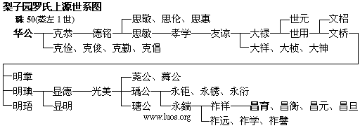 珠公→34世崱→达→珣→仕逢→元圭→志大→宗礼→盛器→浩然→仕颖→昭先→才举、才俊→大经、大异→仲远→介成→秀→50世华