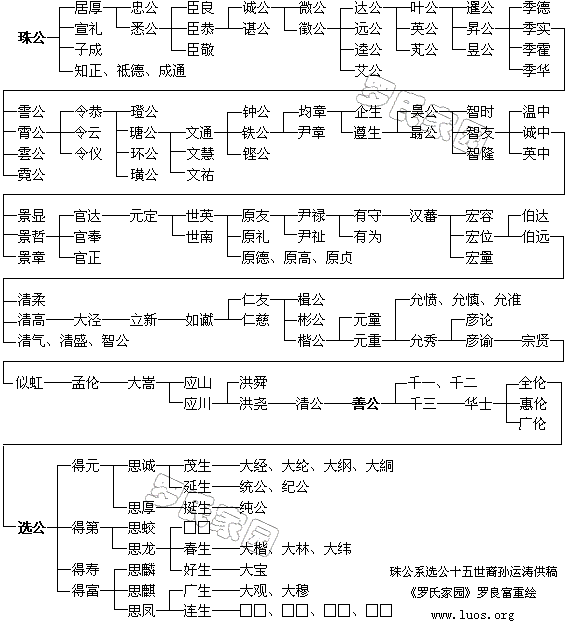 珠公第四十六世孙罗善公,洪尧公子。生元至正 十八年( 1352)。明洪武己卯举人,正统二年任学正、县丞,《霍邱县志》卷八有载。