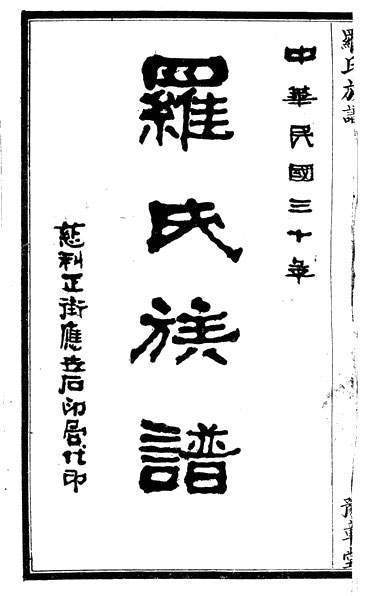 县人 吴愈材 敬叙00000000 三,慈桑石联宗合派起例叙言 粤稽罗氏,鼻祖祝融,始除授豫章,以国为姓,迄今已数千年。其子孙之蕃衍,旁溢四出,散布于国中各行省,几无处不有,要皆支分派别,靡所统纪。如尔我不过数十里,数百里已耳,抑往往庆吊鲜通,见面不知谁何,明明以一本之宗亲,而行路不啻,有心人深痛惜焉。于是裔孙伯宾、玉生、范武、周质等,于中华民国二十八年提倡修谱,诸同姓共列一谱,各叙其所从出。及迁祖之籍贯、年代、居地,并详载其下,以醒目俾阅者易于了解,不致混淆。其间,愿合者合之,不愿合者不强合焉,取同意也。遂与各宗支人会议,更立新派,不揣本而齐末,俾异源以同流。将来卫宗邦强种族,恢先绪裕后昆,未必不在此一举也。姑无论始迁之远近,传次之多寡,皆并驾齐驱,咸归一律。所有各支各派,均胪列于左。
