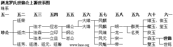 江西赣县江口镇斜龙罗氏世锦公系 据1999年《赣县江口镇斜龙罗氏族谱》载,斜龙罗氏是由珠公——企生——景彦——周吉——涣——珍——世锦传之后裔。世锦公四子周道公(珠公62世孙)由赣县石芫义公坑迁居江口斜龙,成家立业,繁衍子孙。 由于斜龙罗氏长期未修族谱,故乘修《中华罗氏通谱》之东风,重修斜龙罗氏族谱。由斜龙罗嗣茂、罗嗣祥、罗贤迁提供材料,赣县塘基珠公68世孙罗华认真修改并注出公元年号。打印初稿由罗贤迁送回斜龙各家各户修改后,再打印第二稿。第二稿经罗华校正最后定稿。一九九九年春由赣县塘基珠公68世孙贤槐刊印。 该支罗氏字派为大成谱派衍,即: 宋初(1053年)珠公35世纪孙元杰《罗氏大成谱》,编立四十字派