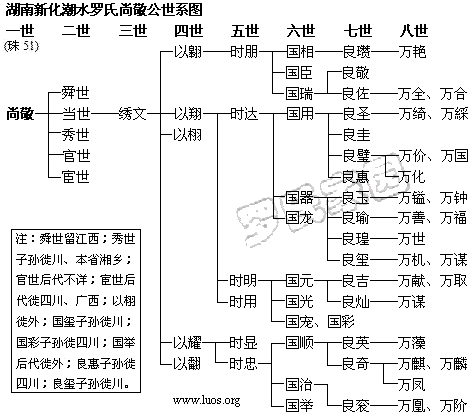 尚敬公,行七,是珠公第五十一代,企生公第三十四代裔孙,江西清泉始迁祖显仲公之曾孙,日良公之长子。明景泰元年(1450)庚午十月初八亥时诞生于江西清江(今江西樟树市义成镇)之清泉。配胡氏,生子舜世。明成化庚子年间( 1480)携子来新化经商,见潮水山秀水清便定居于此。命子舜世返原籍奉祀祖先。尚敬公在潮水娶唐氏,生子二,当世、秀世;再娶李氏,生子二,官世、宦世。当、秀、官、宦四房,在潮水衍为望族。五百年间,其裔遍布湘、川、鄂、桂、陕、赣、黔、苏八省。民国五年修谱《迁徙表》载:清代及其以前外迁人数242人,其中迁往四川195人,广西59人,湖北14人,陕西20人。其外迁祖后裔情况,除四川遂宁万物公系、湖北宣恩(今宣宜)大明公系和允誉公系及广西两支均先后修谱外,其他各支终因年代之远,上几届修谱已失联系,具体情况难以知晓。据估计现在四川有男丁万人以上,广西、陕西及湖北各省男丁各逾干人。相对言之,居住在潮水及附近县市人丁比外迁他省人丁少些,据六修谱载男丁3284人,最小辈份达“昭”字辈,即珠系七十一世。