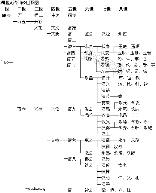 珠公第四十四世孙乃仙公长子万一,字文翁,妣唐氏,生子一,福二。公妣合葬长蒲畈屋宅向东,元朝延祜年间,因“江西填湖广”,由江西徙迁大冶,为开基祖,立业于长蒲畈民籍,即今湖北省鄂州市汀祖镇吴垴村青山头罗家庄,本支系仅有人口七百人。但本支系大部分分布在今湖北大悟县黄站镇长联村境内,那里人口据说有近五、六千人。