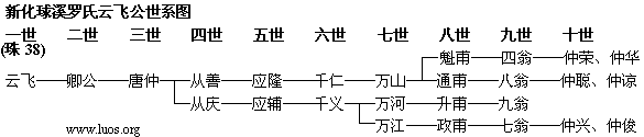 注:云飞公以前世录,旧有四说:永宁乾隆谱称:元七郎即云飞,为彦一之子;鼎溪嘉庆谱称:彦一生云飞和元七郎,实为兄弟;而洋溪万历一修谱断自自雍正二修谱增加风吹草动、达、皎、议、遵、元、先、徽、安世、彦升、景亨、询十二代;乾隆三修与永宁合谱时,询以上不录;嘉庆谱又分修;根据学富公手录吉州世系图,仍增十二代;鼎溪谱除乾隆外,历届均载云飞为一世祖。四说纷纭,莫衷一是。民国年间新化通谱总修洋溪瀚溟公考证:徽徽社以上至则公,均有年代可考,下至询祖则生殁年代未详。而江西通谱则祖为唐懿宗时人(约公元870年左右),议公殁于宋真宗大中祥符元年(公元1008年)。若云飞当生宋考宗时(公元1180年后)又秀川谱载:按洪先谱:询下未载系,此询祖乃后人所附。并考洋溪谱序:有考宗派于吉州,今渊于老谱籍之语。知是原谱云飞为询祖子后人。见嘉庆谱:景亨之子曰询,则不分年代之远近,将云飞排于45世询之下,不知前九世祖议公季 第也是询祖。以致秀川遗谱传讹。根据其年代考之,云飞为议公季弟询社之子,才相符合。故议祖之下至询祖八代当从删,云飞应为三十七世询祖之子(以上注,由新化县科头乡罗海清考证)。
