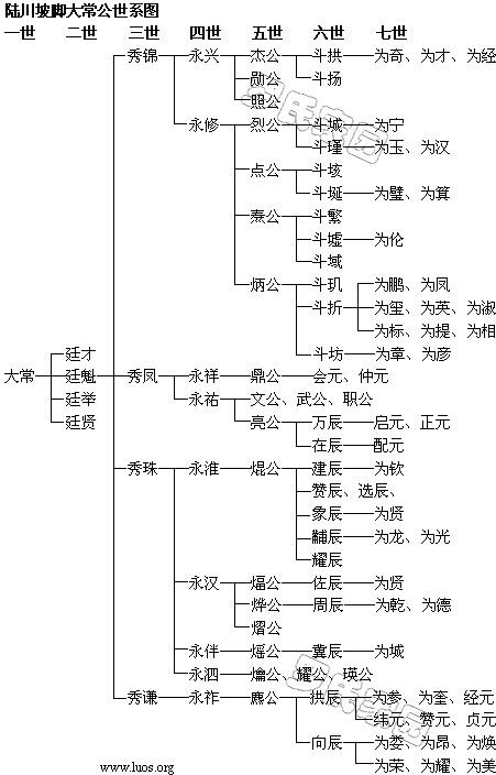 作者:罗永杰 罗立宪http://www.luos.org 大常公,名启成,原籍江西吉水县。明成化、弘治之交,公偕妻卓氏携四子共六人同迁广西,先居郁林,旋移居陆川,在乌石坡脚开基立业,为一世开基祖。未几,启成因思故乡,遂同长子廷才与四子廷贤回归吉水。而卓氏因喜新宅,偕二子廷魁、三子廷举居陆川,“相阴阳,披荆榛,辟土地,以一人而开万世之基”。 坡脚罗族至今500余年,已传二十三世,丁口约一万五千人,为当地著姓巨族。除以坡脚村为中心,分居70个自然村外,七世为焕,迁化州新圩塘口磨屋田;八世八材、十世定汉俱迁北流东华;八世眩洪,裔居清湖山腰;十一世托公,迁兴业大坪;坚公,迁化州甲隆六云罗屋;祖昂,迁博白大湴;十二世良照,迁本县沙湖三甲大塘角、木头塘;十三世道龙,迁玉林南街、大牛窝上岭垌;久思,迁北海六靖。