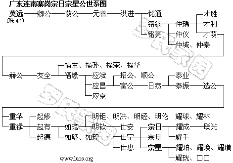 谱载,昭远公弟英远公(万公三子),为一世始迁祖。生子一,卿公:卿公生子一,荫:荫公生子一,元善;元善公迁居龙川县;元善生子一,洪进;洪进生子三,铭通、铭饷、铭亮;铭饷生子四,仲瑀、仲仪、仲城、仲泰;仲瑀生子三,才胜、才利、才荫:才荫生子赫,赫生子友全;友全生子五,福缘、福生、福孙、福荣、福华;福缘生子三,应斌、应昌、应京;应昌生子三,招、顺、富:富生子,日恭(法名“罗千一郎”):日恭生子二,泰振、泰业:泰振生子一,选:选公生子二,重华、重禄;重禄生子三,起修、起有、起德:起有生子三,如琯、如珞、如瑝;如瑢生子五,明钦、明钜、明洪、明经、明伦:如珞公由龙川县黄泥坪团迁居台山县推车朗村;明钦生子三,仕安、仕宁、仕忠;明钦公再迁居台山县东山巷中心堡。仕宁生子三,宗日、宗月、宗星:宗日公清乾隆三十三年生(1768),子四,耀球、耀林、耀成、耀千(无嗣);耀球、耀琳兄弟二人仍留居台山故地,耀成生于清嘉庆十一年(1806),子一,联光。