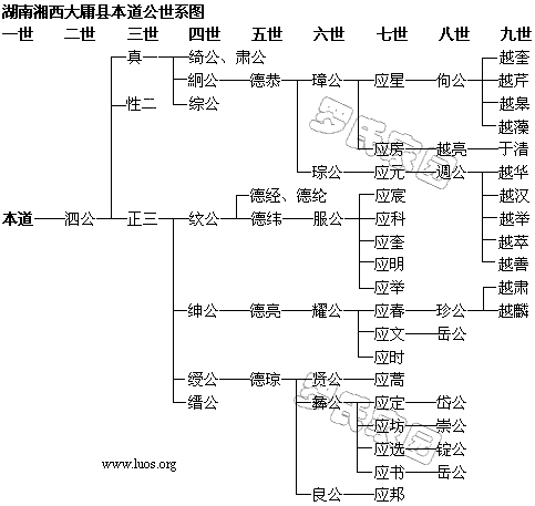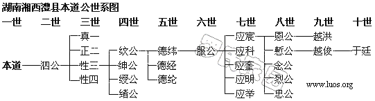 始迁祖本道公,祖父绶珥,父嗣真,祖籍浙江绍定府余桃县第四里梅川二十五都恶蛇溪矮庙,兄弟三人,兄本成公居祖籍,弟本祖偕从落籍湖南安福县(今临澧县)。本道公于洪武十三年(1380)奉命征剿辰州、泸溪、溆浦等处叛乱,至洪武十九年乱平,授职怀远将军(史志无载,待考)。率兵镇守辰州、泸溪,遂为一世始迁祖。裔分居怀化、自治州、常德、张家界四个地区及湖北天门市等地。其间大庸后裔七世应科迁沙堤乡沙田村罗家岗:十一世万连迁茅岗司:十五世祥远迁木纳里汤家山:十六世宏儒迁官黎坪。垂今已历传二十三世,繁衍族旺。