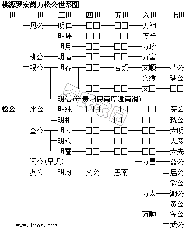 据族谱记载:“始祖松公原籍江西吉安府吉水县林栗树土地,前明时访仙源古迹,爱山水清奇留恋不忍去,遂卜杜青村木塘坪中,今罗家湖其故址也。”又据谱中记述,始祖松公南迁的时间为明朝万历年间(1574 -1624),具体哪一年不详,查阅《县志》无考。由此推算,松公南迁的时间已有四百二十年左右。由于遭明季兵燹和回禄,江西老谱及其有关草谱都已荡然无存,使该族之源流、松公以上的世系世纪都茫然不知,留下了诸多遗憾。近年来,各地谱事活动十分频繁,通过互相交往和调查,弄清了一些史实。原来,桃源其他罗姓都是于明朝永乐二年(1404)由江西吉水迁徙而来,比松公迁木塘的时间早了一百七十多年。从繁衍的代数计算,桃源雷公堰、七里桥、泥窝、录豆坪的罗姓已繁衍了二十七代,比松公繁衍的二十一代多了六代。由此可以断定木塘松公罗姓一支,是从桃源、常德、汉寿等地的江西罗姓移民中迁徙而来的。在调查中,还发现桃源七里桥开一公系与松公最有渊源关系。