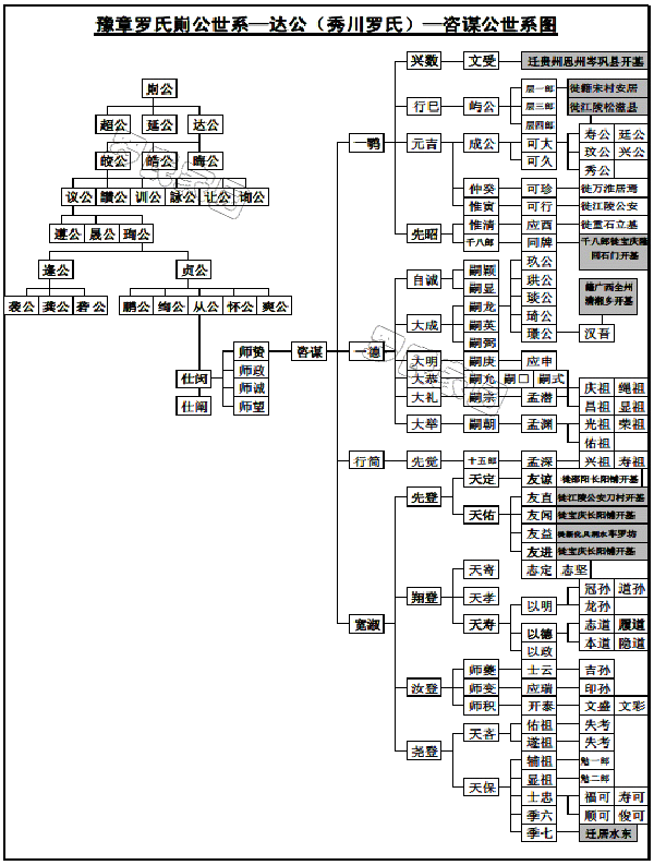 友孟仲必才,应文思祖廷,宗志信朝先,用显达永世,宏乾坤益祥(待续)。 3、上源世系: 据秀川家谱记载,属珠公(豫章罗氏始祖)-瑭公(南昌柏林罗氏始祖)--企生公--崱公(江西庐陵县秀川始祖)-达公-皓公-珣公-贞公-从公-仕闵公-师贽公-咨谋公-宽淑公-先登公-天定公-友谅公世系。 上源世系如下图。其上源各代世系文字资料详见罗氏通谱网站。