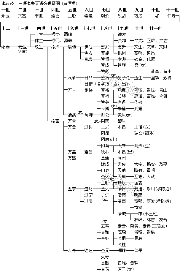 十三世祖:次房云达公(字天透) 云达公,讳天透,绍器公次子。娶翁氏生三子:长丁生、次佛生、三晚生。公于乾隆初叶渡台,入垦桃园龟山,为始迁祖。后因欲回唐,下船至厦门港,被船工所害失船。享寿六十七岁。翁氏妣母,生于乾隆戊午年四月初十日申时,卒于嘉庆辛未八月二十六日未时,后葬龟崙岭,坐北向南。