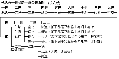 十世祖:长房一郡公(字洪宇) 一郡公,万成公之长子,谥洪宇,葬上坑岭下乌鸦落洋,妣朱氏二娘,葬门口岗,祖妣墓今尚存。一郡公生四子:长仁炤、次仁通、三仁广、四仁寿。十一世仁寿公,一郡公之四子也,住坪顶额,妣李氏,生一子:绍器。十二世绍器公,仁寿公之子也,妣蔡氏,生三子往台:长华达、次云达、三汝达。
