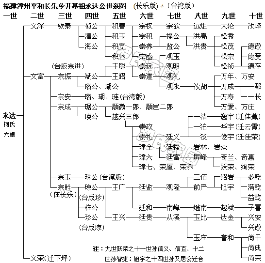 作者:台湾罗柏青/(原作) 重庆罗良富/(改编)http://www.luos.org 开基一世祖:永达公(福建漳州府平和县) 始祖长乐公讳永达,大埔湖寮公明公(字德垂)六子伯六郎,行二十四郎,汀州府宁化县石壁人也,分居福建平和长富村(长乐社)。公之考妣讳字卒葬,因元季火烬无传,只传公为长乐始祖,大抵自始祖以上之坟穴,祖宗皆在宁化。公溢朴茂,葬于本处鹧鸪坑,金星作穴,坐丑向未,虾公穴。妣柯氏讳庄肃,葬坪回窑前,山口蛇形。生三子:长文深、次文富、三文荣(有说文荣为永达公之侄)。 八世起昭穆:世德汝翰映伊于宗仰承绍则安敬惟崇敏日能士家业昌乃文启武克圣之光