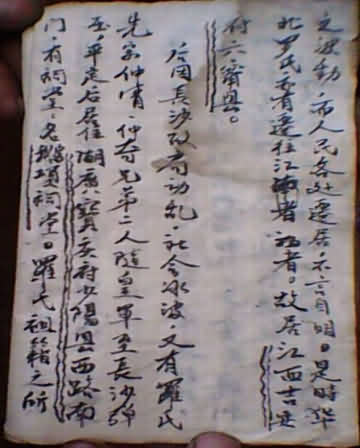 上述记载中,故居江西吉安府六宁县,应为庐陵县,历史上吉安就是庐陵,但故居在吉安是没有错的。还有就是记载:后因长沙政局动乱,社会冰波,又有罗氏先宗仲青、仲奇兄弟二人随皇军至长沙弹压,平定后局湖广宝庆府邵阳县西路南门,有祠堂,名□□□祠堂。罗氏祖籍之所谓:江西填湖广者,其源也在此也。兵戈停息,仲青、仲奇于湖广忠厚传家,诗书处世,至第十四世,已有子孙多人。 这里记载的仲青、仲奇公是随军来湖南,平定长沙后才定居的邵阳,与湖南邵阳家谱不符。但是根据这些记载和字辈光亲公确是仲奇公后裔无疑。 查邵阳家谱,仲奇公后裔正字辈有三个正刚公: 1、正纲,国璿公长子,字全三,康熙戊戌年(公元1718年)三月初二午时生,殁葬未详,配李氏,生殁葬未详,子嗣未详。 2、正刚,国湖公三子,配萧氏,俱生殁葬未详,生子三:经一、经二、经祥。 3、正刚,国胤公长子,公元1738年十月初七申时生,配蒋氏,俱生殁葬未详,生子四:经春、经夏、经秋、经冬。 从上面三个条件比较,因后两位均有子嗣在邵阳,第三位正刚公生于公元1738年,且有四子:经春、经夏、经秋、经冬。只有第一位正刚公,其子嗣邵阳家谱没有记载,从时间上来看,根据赫章的记载,光清之孙兴宗公生于公元1844年,该正刚公生于公元1718年,三代人间隔了126年,也不太对。 其上源世系还需进一步考证。
