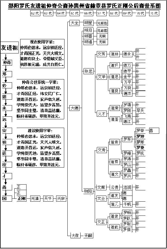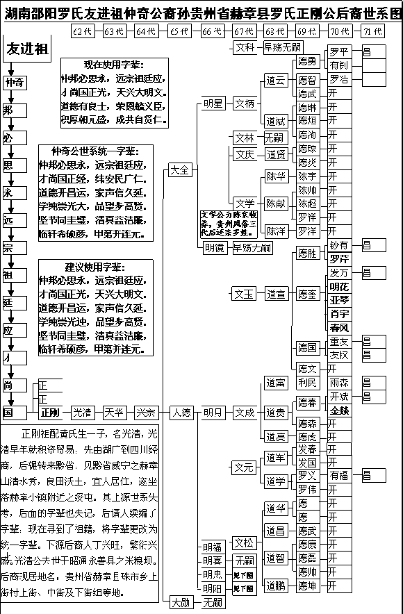 五、后裔情况 1、光清,正刚公子,生殁不详,葬昭通永善县米粮坝,配曾氏,绥屯曾公之女,生一子天华。 2、天华,光清公子,生殁不详,葬赫章诺素,配王氏,赫章狮子窝王公之女,生一子兴宗。 3、兴宗,天华公子,生于一八四四年腊月十六辰时,殁于一九一七年正月二十六日辰时,葬赫章诺素。配谢氏,诺素街上谢公之次女,生于一八四一年九月十九日子时,殁于一九一四年十月二十八日亥时,生三子:大全、大德、大勋。 4.1大全,兴宗公长子,生于一八六六年五月二十三辰时,殁于一九四七年八月初八日卯时,葬妈姑阿维寨。配陈氏,赫章反背磨平湾陈天玺之长女,生于一八七五年五月二十六日已时,一九四0年八月初三未时殁,葬小山坡脚,生二子:明星、明镜(早夭无嗣)。 4.2大德,兴宗公次子,生殁不详,葬赫章诺素街上送包树坪子。配刘氏,威宁二塘芭蕉坎人氏,生殁不详,葬团结村台砂坝,生五子:明月、明福(无嗣)、明喜(无嗣)、明忠、明阳。 4.3大勋,兴宗公三子,生殁不详,葬赫章诺素。配叶氏,生三女:润之、金之、银之。 5.1明星,大全公长子,生于一九0五年三月十二日已时,一九八七年六月二十五日未时殁,葬赫章诺素石丫口。配吴氏,早逝,续配刘氏翠妹,赫章附近大冲刘启庚之四女,生于一九一七年闰二月十八亥时,殁于一九五四年八月初八日卯时,生五子:文科(无嗣)、文柄、文林(无嗣)、文庆。三配刘氏,刘启庚之三女,生子一文学。 5.2明月,大德公长子,生于一八九二年十月十一日,一就四四年九月二十三日殁,葬赫章诺素街上送包树坪子,配彭氏,生四子:文玉、文成、文元、文松。二女:小云、怀云。 5.3明忠,大德公四子,生于一九0一年,殁于一九三三年,葬诺素陆陆地,配张氏,珠市乡得块村高明组张桂发长女,光绪二十九年癸卯年一九0三年九月十二日寅时生,一九九八年冬月二十五日辰时殁,葬诺素爬坡路。生三子:文芳、文举、文才; 5.4明阳,大德公五子,生于一九0九年十月十一日,殁于一九八六年三月十一申时,葬诺素街上送包树坪子,癸山丁向。配肖氏,生四子:文秀、文辉、文全、文正。二女:乔妹、文英。 现在正刚公的后裔就是明星、明月、明忠、明阳四大房繁衍而来。后裔仍安居于现在的贵州省赫章县珠市镇上街村。现在是四代同堂,老辈是文字辈(对应邵阳统一字辈是传字辈),还有五人,小辈已到开字辈,现在道字辈男丁有30人,德字辈男丁有56人,真是人丁兴旺,繁衍兴盛。 其后裔也一直在寻宗,一直到2012年底,罗道华、罗德胜宗亲通过网络与我和罗德荣联系上,后通过罗道华、罗德胜宗亲寻找到贵州省六盘水大湾镇罗家院子居住的仲奇公房安昌公的后裔及迁居到威宁猴场镇居住的安金公后裔。其后裔世系图如下: