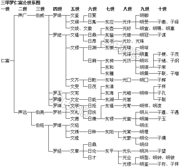 三甲罗氏的班辈字派从“仁”字到“子”字这十辈内是统一的,后来由于支派增多,各村寨自定字派。到了清朝末年,经各支系代表在筹建信都罗氏联合大宗祠(没建成)会议上讨论,重新定出统一的班辈字派,及至后来在重修仁富公墓茔的两次会议上,再次把班辈字派作了扩充。