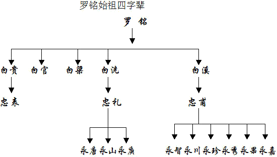 由罗润德、罗佐卿、罗海遊、罗遐龄等为首,会同族中各房协商,在古佛堂后面寺上堡侧又修建宗祠一座,每逢清明,孟冬佳艿祭祀祖先,会族踴跃聚会。将我全族人等形成勇跃和睦一家,恰将宗祠竣工,族谱完善,拟定四十字派别,全国就被解放。同時拟定“同宗发万代,百世显昌荣。朝廷守礼仪,官清永道成。孝弟傅家宝,齐思治国民。厚德广吉庆,褔祿振远年”四十字为新的族谱字派。经全族通过赞同刻碑执行。又议定各房在“大堂明官正祥”全部合成以下为同字辈,都按“同宗发万代……”逐代相传。远数十年来由于形势多变,各房人员增多,居住各异,对字派有的不知其详,有的不顾整体,随心所欲又各拟字派,以致发生分不清長幼,乱称乱呼的乱常现象。