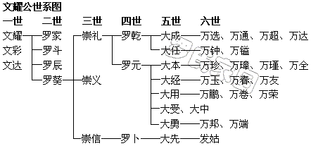 一世叔祖:罗文彩,字耀庭。明崇祯元年,钦嘉五品衔,特授四川北川金县正堂、候补钢仁府陞授奉政大夫,修政庶尹。