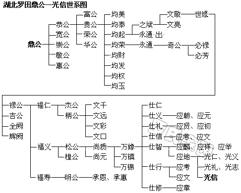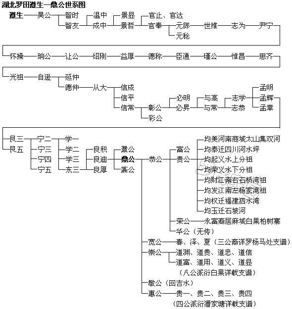 鼎→宽→春、泽、夏,三公后裔详罗杨马处支谱。 鼎→崇→道渊、道贵、道忠、道信、道富、道用、道义、道显,八公派衍白果详载支谱。鼎→敏回吉水、惠迁岗邑,即今黄岗→贵一、贵二、贵三、贵四,四公派衍潘家塘详载支谱。 贵公三子均起→之斌、永通过继荣公,之斌→文敬、文亮分图另记,文敬→世缘→禄、吉分图另记、全阙、辉阙。本文来自罗氏家园 禄→福仁→杰分图另记、柄→文千分图另记、文远分图另记、文彩、文□。 禄→福义→松、楻分图另记,松→尚质、尚元,尚质→万鐌→仕仁、仕义、仕礼、仕信、仕智、仕行、仕修,尚质次子万镇,分图另记、万锦分图另记。本文belong to罗氏家园 禄→福寿→明→承思分图另记、承惠 仕义→应朝、应元,仕礼→应贤、应初,仕智→应麟、应祥、应举、应地→光仁、光义、光礼、光志,光信迁罗田十里铺,仕信→应考、应文,仕修→应章。