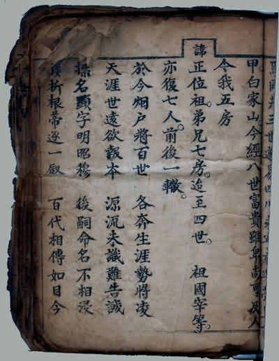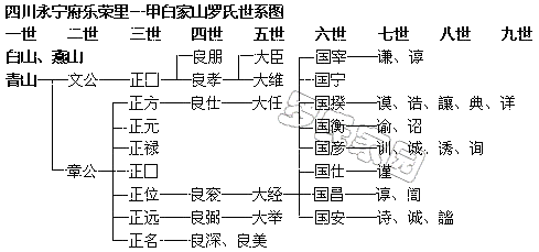 闻之家有谱,犹国之有史也,国无史政事不着,家无谱,则宗支不传,谱之所系,重矣,念我罗姓一家,迄今在川,实繁有徙,可纪极矣!然溯生民之初,受姓之始,世远年湮,杳不可考,惟宋元期,启祖始自江西吉安府庐陵县,曾受湖北通州太守职,善政多闻,当时称为盛事,后世独传为美谈也!孰知兵戈四起,同派各散天崖,而保聚遂无闻矣!幸我祖自麻城避祸,入藉贵州桐梓县娄化里罗家坝居数代焉,同井三世,遂易四川永宁府乐荣里一甲白家山,今经八世富贵虽卑,尚可及人。