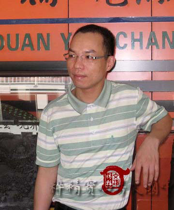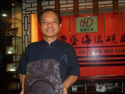 罗松彪(1879~1956),字炳垣,号玉铨。传承惠福坊罗宝、罗赞兄弟的砚雕技艺,以雕刻梅雀、花卉及仿古纹饰见长,刻工细腻,线条流畅。其作品曾获1901年巴拿马工艺美术大赛二等奖。他还是远近闻名的雕刻字画高手,现鼎湖山庆云寺的“百梅诗”和“墨梅”石刻均出自其手。由于罗松彪砚艺精湛,加上为人正直,精明能干,在砚界颇有口碑。后被推选为“惠日端砚行”值事(行长),管理行会事务。创办“玉铨斋”端砚店铺。(左:端砚罗氏世家嫡传后人罗建强)
