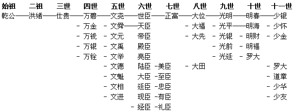 注:因前族谱遗失的原因把“清、时、来”,误取为“道、德、红”三字辈。后于公元一九八七年在罗万碧身故清元府,康熙乙未年意致簿中,与罗光银故,一周除服请荐中,注一周于民国五年丙辰月建已亥朔日丁酉时,查从一世祖至五世祖。在一次清明会的时候,由于两房人一房说我们穷和另一房在“清”字辈时,另一房改为“少”子辈,其实清和少是同辈。又由于前面的误取,所以道、清、少三个字辈都是同辈。