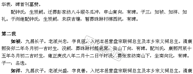 文华,盛远三子。行三,族行六,老派福华。清乾隆乙亥廿年正月十八吉时生,没阙。配梁氏,乾隆庚戌廿五年正月十八吉时生,没阙。子一:昌铨;女一:适某。