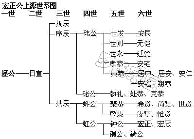 五世 钟,虹公幼子。生子二,长子宏正任吉水主簿开基澄溪,次子宏厂随父居白芒。