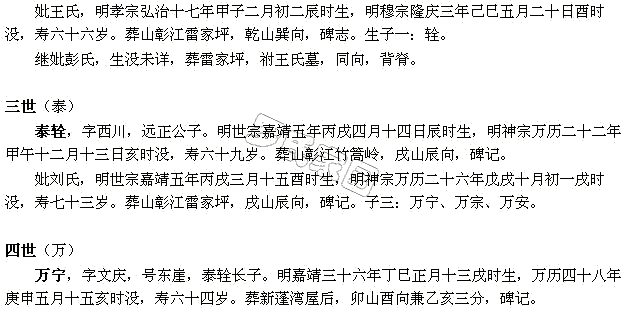 妣萧氏,明宪宗成化二十一年乙巳三月初二酉时生,明世宗嘉靖二十年辛丑六月初四卯时没,年五十七岁。葬小桥铺水口山,壬山丙向,碑记。坟茔罗筐毋准越破,任罗春秋挂扫祭拜。生子一:远正。