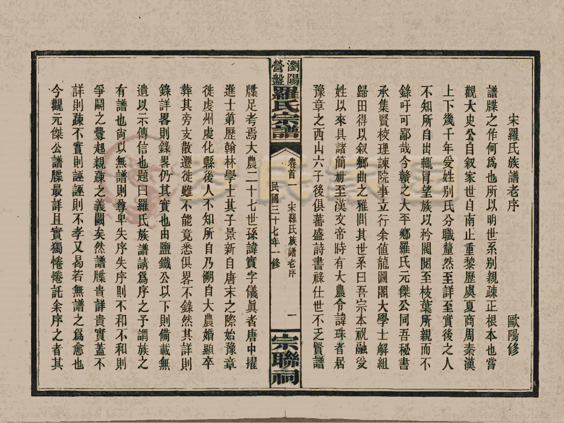 宋·欧阳修·罗氏族谱老序 谱牒之作何为也,所以明世系别亲疏,正根本也。尝观大史公自叙家世,自南正重黎,历虞夏商周秦汉,上下几千年,受姓别氏,分职厘然至详至实。后之人不知所自出,辄冒望族以矜阀阅,至枝叶所亲而不录。吁,可鄙哉!今赣之大平乡罗氏元杰公同吾秘书丞集贤校理谏院事立行,余直龙图阁大学士,解组归田,得以叙乡曲之雅。问其世系,曰:吾宗本祝融,受姓以来,具诸简册。至汉文帝时,有大农令讳珠者,居豫章之西山,六子后俱繁盛,诗书禄仕,世不乏贤,谱牒足考焉。大农二十七世孙讳实字仪真者,唐中擢进士第,历翰林学士。其子景新,自唐末之际,始豫章徙虔州虔化县。后人不知所自,乃溯自大农,婚显卒葬,其旁支散迁徙虽不能竟悉,俱略不录。然其详则录详,略则录略,仍其实也。由盐铁公以下,则备载无遗,以示传信也。题曰《罗氏族谱》,请为序之。余谓族之有谱也,尚以无谱,则尊卑失序,失序则不和,不和则争斗之衅起,亲疏之义阕矣。然谱牒贵详贵实,盖不详则疏,不实则诬,诬则不孝,又曷若无谱之犹愈也。今观元杰公谱牒,最详且实,犹拳拳托余序之者,其仁人孝子之用心欤!抑太史公之志欤!罗氏之族愈蕃愈远,诗书礼义久不替也。 时