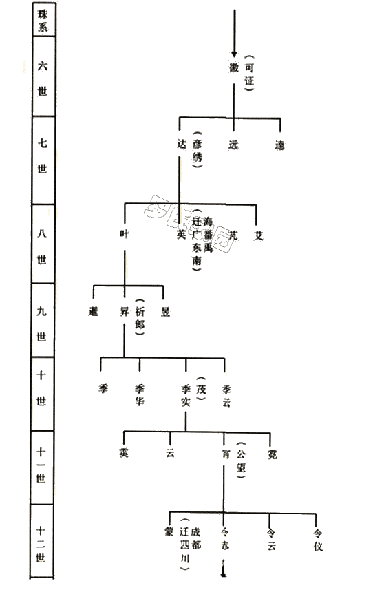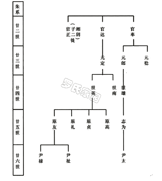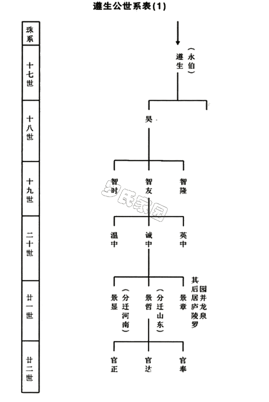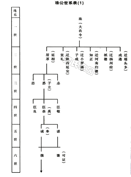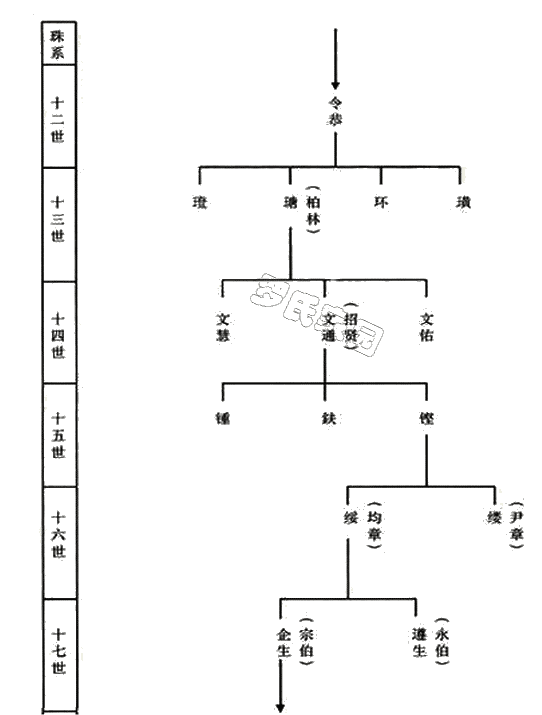 注:遵生公字永伯,均章(绥)公次子,企生公之弟也。事母至孝,东晋时,初辟为州祭酒,值桓玄之乱,企生死节,遵生则养母抚孤,以全宗祀,世称孝友。累官至侍御史,以直谏有名。其后数传至景显,景哲二公,一迁河南,一迁山东,再折南昌西山。 遵生公传五世景哲(珠公第廿一世),景哲再传十一世至罗仪真(珠公第三十二世),罗仪真因避黄巢之乱,携子罗景新由南昌西山迁虔州虔化县(今赣州宁都县),历数十年,又迁福建宁化石壁村(现今三明市宁化县石壁镇石碧村南田自然村)定居。 珠系卅三世 宁化石壁罗氏开基祖景新公,字文新,号大庆,为仪贞公长子。生于唐中和辛丑(公元881年)九月十七日午时。随父避黄巢之乱,由西山徙虔州(宁都)太平乡鸦鹊林,后迁福建宁化县石壁洞葛藤村紫源里(今南田村)居焉。卒于后周广顺癸丑(公元953年),寿六十三。葬鸦鹊林。配邬氏,生于咸通癸巳年,殁葬兴教里曹隆坊林园前。后迁葬石壁洞仙人提壶形,酉山卯向。子七:仕伦、仕伟、仕俊、仕杰、仕传、仕仁、仕仪。 卅四世 仕伦,名强修,字对山,行第一,景新公长子。生于唐乾宁丙辰(公元896年)十月初六日丑时。仕至宣教郎,宋举孝廉。曾居吉水县巷口,为起居始祖。宋开宝乙亥年殁,寿七十岁。葬宁化县石壁村二十四都东山下麻油坑,王母点兵形,丑山未向。配吴氏,宁都大布人女,葬黄沙罗潭;继配吕氏,葬宁化县石壁村二十四都曹顿麻油坑。子三:元杰、元升、元捷。 卅五世 元杰,讳振,字养晦,名先政,行二九郎,仕伦公长子。生于后晋高祖天福丙申(公元936年)十二月二十日戌时。宋初擢进士第。历翰林学士。仕江南扬州刺史,调任虔州太守,即今赣州会。当其货书入广,偶遭厄,海涯不通。后欲还乡,蒙傅平章相公吩咐湾太守马公送回,辞官不仕。于雍熙甲申年八月叶琼还家。因盐铁史仪贞公所遗世系,主修家谱,督侄立行纂修并集欧阳修、刘敞二先生作序。公尝在永平、襄阳、长沙、豫章西山、山东、浙江等处访问宗族,立明世谱以垂后世。卒于宋至和乙未(公元1055年)十一月十五日未时,寿一百二十岁。葬宁化县十二都黄土板宫前,鹅形,午山子向。配陈氏,封夫人,葬杨源社,人形,乙山辛向。继配杨氏,封夫人,葬本村宫前夫墓侧;三配李氏,葬杨源社陈氏墓侧。子六:子遵(杨出)、子遗(陈出)、子违、子建、子远、子达(皆李出)。本文&belongto罗氏&家园 卅六世 子建,字鼎,行六郎,元杰公四子。生于宋乾德丙寅(公元966年)二月十三日酉时。擢进士第世袭承事郎,官至礼部尚书。卒于景佑丁丑年,寿七十二岁。卒葬宁化县石壁村高坑,幡花龙形,丑山未向。配殷氏,继配邓氏,续配陈氏,三妣同葬石壁村广昌牛角湾,走马攀鞍形,午山子向。子二:仲太、伸太。 卅七世 仲太,讳迪,行五郎,子建公长子。生于宋淳化庚寅(公元990年)九月十二日巳时。例授承事郎。卒于宋仁宗皇佑己丑年,寿六十一岁。葬上冷田,蟹形,丁山癸向。配王氏,葬夫墓。子二:谋、谟。 卅八世 谋囗,字权周,行少七郎,仲太公长子。生于宋真宗祥符丙辰(公元1016年)三月二十五日巳时。卒于大观己丑年,寿九十四岁。例授承事郎。葬本里白竹山,海螺形,甲山庚向。配黄氏,葬夫墓。子二:俊、杰。 卅九世 俊囗,字希贤,号秉仁,谋公长子。生于康定元年庚辰(公元1040年)。例授承事部郎,大学士。卒葬天师迳,东南向。配陈氏,合葬兴都里白坑,象形,山巽向。继配刘氏葬夫墓。子二:仲权、仲柄。 四十世 仲权,字渊,号澹湖,俊公长子。生于宋仁宗嘉祐壬寅(公元1062年)十月二十三日子时。仕至山西参军。偶遭时厄,致仕还乡。结庐对泉,潜心力学,不求仕进。士林重其名节,一时学者多师之,称澹湖先生。卒于南宋高宗绍兴乙丑年,寿八十四。葬于金坝上水,游鱼形,巽山乾向兼巳亥。配赖氏,合葬夫墓,巽山乾向。继配李氏,葬十四都虾塘。载配黄氏,葬于黄金坝。子三:安庆、乐庆、荣庆。 四十一世 荣庆,字恭,仲权公三子。生于宋元祐己巳(公元1089年)十月廿七日酉时。为人宽洪厚重。八十高龄祝寿时,朝廷赐匾,授耆民修职郎。殁于南宋孝宗淳熙乙未年,享寿八十七岁。妣谢氏,合葬本都岳源高冈,丁山癸癸向。子四:思珩、思纯、思传、思广。 四十二世 思珩,字真,荣庆公长子。生于南宋高宗绍兴四年甲寅(公元1134年)二月二十一日巳时。仕至吏部员外郎,转御史中丞。殁于南宋中宗嘉定辛巳年,寿八十八。葬上顶源罗家园,旗形,巳山亥向。配龚氏。葬上顶源黄家坪。继配刘氏,葬黄家垅,南向。子三:奉先、奉初、奉生。 四十三世 奉初,字盛贤,号仲,思珩公次子。生于宋高宗绍兴二十八年戊寅(公元1158年)三月二十日寅时。任行台仓部郎中,仕至御史中丞。配张氏,合葬罗家园。继配曾氏,葬夫墓。再配汤氏。子五:昌龄、延龄、元龄、宏龄、享龄。 四十四世 昌龄,讳文,字应朝,号鹤山,奉初公长子。生于宋淳熙甲午(公元1174年)九月十五日巳时。配曾氏,合葬罗屋背。继配欧氏,合葬夫墓。载配李氏。子三:尚古、尚崇、尚立。 四十五世 尚崇,讳史,又名崇古,字实高,昌龄公次子。生于南宋宁宗庆元丁巳(公元1197年)七月二十四日酉时。配谢氏,合葬罗屋背父墓傍。子三:洪源、洪德、洪敬。 四十六世 洪德公,讳用格,字必元,行五郎,尚崇公次子。生于南宋宁宗嘉定八年乙亥(公元1215年)五月初十日午时。理宗景定三年(1262年)壬戌科擢进士(47岁中举)。仕湖北咸阳县令,升抚州太守