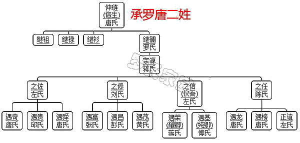 始祖 罗仲琏,生:继祖、继禄、继衫、继襕四个儿子。 二世 罗继祖、罗继禄、罗继衫:三个远去荆襄后就没有了联系。 罗继襕:娶妻罗氏,生宗源,继襕生于湖南葬于故土,立墓雨坛坪。继襕也葬于雨坛坪。 三世 罗宗源:宗源娶妻蒋氏,迁居水东里十家塘,新房子地名叫两头屋基。宗源生之佐、之修、之信、之任四个儿子。宗源葬于老塘书。 四世 罗氏罗之佐,亡于湖南,葬于老塘书。娶左氏,生:遇奇、遇贵、遇舜三子。 家园罗之修,娶刘氏,生:遇富、遇昌、遇茂三子。 罗之信,字仪吾,亡于湖南,葬于湖南,地点没有记载。娶左氏,生:遇荣、遇基二子。 罗之任,娶陈氏,生:遇龙、遇榜、正谊三子。 五世 罗遇贵妻邱氏,子三仕妻莫氏、三易妻徐氏; 罗遇舜妻唐氏,子三仁妻唐氏、三傅妻李氏、三元妻罗氏、三重妻熊氏; 罗遇富妻张氏,罗三圣妻陈氏、罗三楚妻张氏、罗三湘妻唐氏; 罗遇昌妻彭氏,子罗三联妻谭氏、罗三标妻蒋氏、罗三锡妻魏氏、罗三略妻左氏; 罗遇茂妻黄氏,子罗三策妻李氏、罗三才妻王氏、罗三聘妻龙氏; 罗遇荣(字耀卿)妻蒋氏,子罗三伦(字德先)妻黄氏、罗三春(字魁先)妻顾氏陈氏;罗三祝(字福先)妻蒋氏、子罗三逊(字虞先)妻蒋氏;本文belongto罗&氏家园 罗遇基(字纯卿)妻傅氏、子罗三理(字文先)妻粟氏; 罗遇龙妻唐氏,子罗三俊妻张氏、罗三伟妻魏氏、罗三佑妻张氏、罗三鼎妻杨氏; 罗遇榜妻唐氏,子罗三位妻陈氏、罗三墳妻蒋氏陆氏、罗三贤妻刘氏; 唐正谊妻左氏,子唐希尧妻邹氏、唐希舜妻唐氏、唐希文妻唐氏。