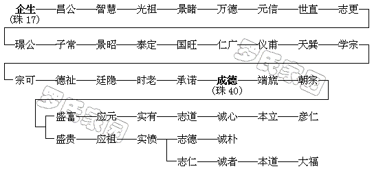 成德子端旒,端旒子朝宗,朝宗子盛富,盛富子应元,应元子实有。至今已历三十世约八百年,瓜瓞绵绵,家声丕振。