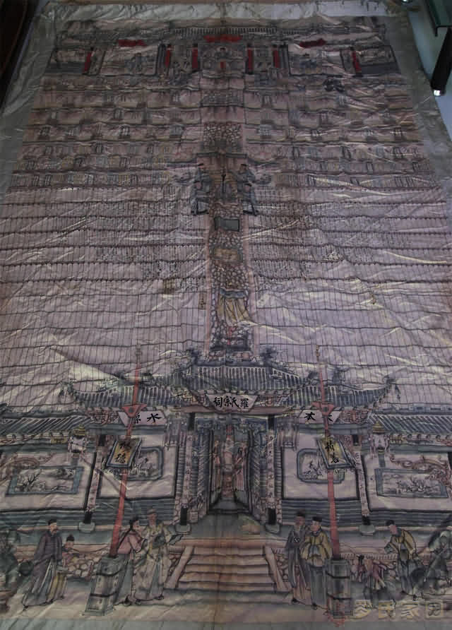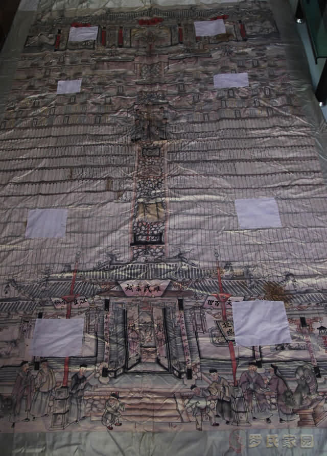 此图为女性图谱。补丁处为后人手工修补破损处。神祇长3.8米宽2.3米,画有记载罗氏立祖开始到下沿十三世1400多人。内容丰富,记载清晰。据推断罗家神祇距今有400多年历史。是两件不可多得的民间历史文物。对于研究中国家族文化是十分难得的实物。