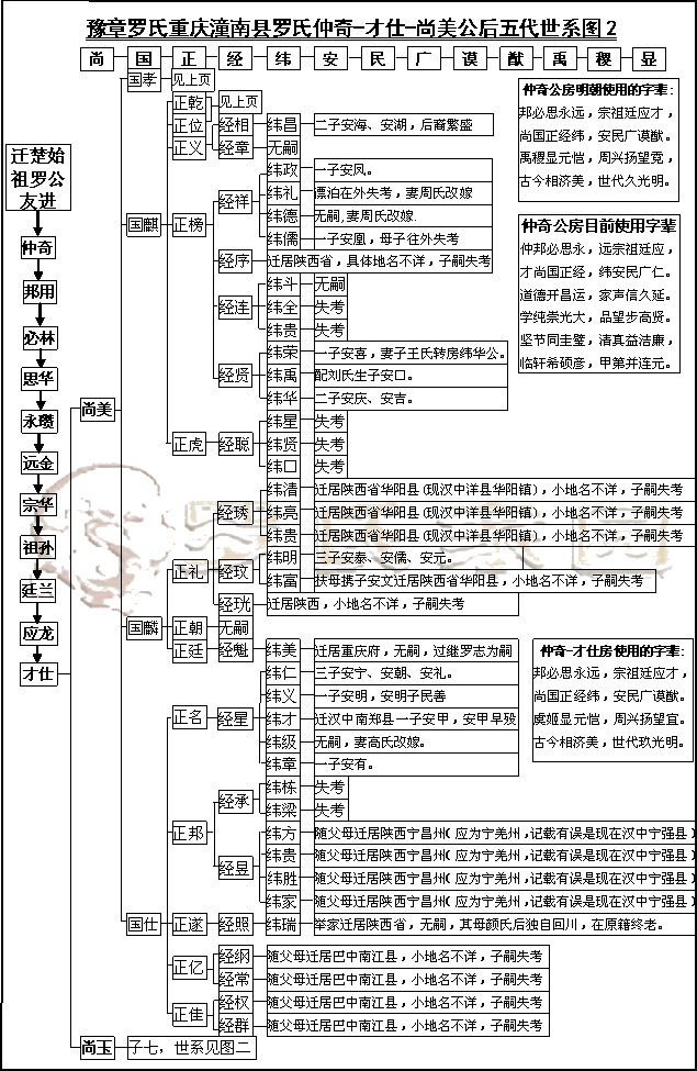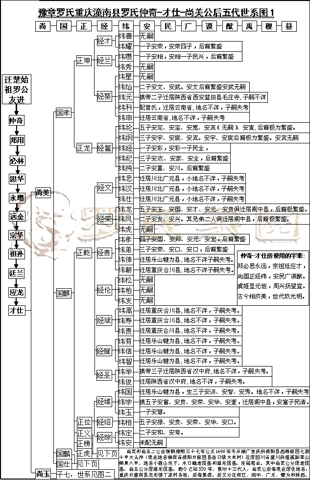 尚美公迁居潼南后,子孙繁衍兴盛,后裔发达。其中国字辈有4子,正字辈有14子,经字辈有34子,纬字辈在潼南就有73子,安字辈更多达上百人,由于人多地少,资源有限,为了生存,其后裔从经字辈开始,不断有后裔迁居外地,最多是在清朝乾隆后期和嘉庆年间,大多迁居四川本省和陕西省汉中地区,也有迁居云南的。根据家谱记载,经字辈和纬字辈有三十五房人外迁,据了解,这些外迁宗亲,在迁居之后一直未能辉原籍认祖,现特将外迁宗亲情况特抄录如下,希望外迁的宗亲能够看到此文,到潼南来认祖归宗。本文belongto罗氏家&园