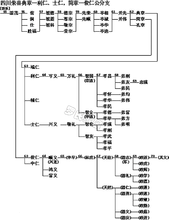 ●典章公派下世系 六十三世 端仁,典章公之长子;配邬氏、叶氏,生明义、有义、光义、全义四子;由四川省荣县陈家场官房沟碾子冲迁贵州遵义县西乡八里龙井落业。(另文) 利仁,典章公之次子;配林氏,生亨义一子。 辅仁,典章公之三子;不详。 士仁,典章公之季子;配龚氏,生兴义一子;落业胡家土。