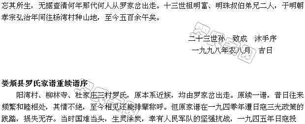 降,抗战胜利。后又打了几年内战,一九四九年大陆解放,中华人民共和国成立,及时恢复战争创伤,进入社会经济建设,相伴着各种运动多起,故未着手续谱。历时年久,原谱无存,先辈去世,要想将七百余年的历史,按血缘接上,难度可想而知。幸有杨湾衬老茔墓碑未遭破坏,较为完整,提供了这次修谱的主要依据。采驭了墓碑查看,老者交谈,知情者访问,经二年多时间的查访研究,阳湾村十六世、柳林寺九世、桂家庄五世就绪。桂交曲、罗家岔原留居人众,至一九四零年后夫传,文物墓碑遭损,只在一家院内找到明朝嘉靖拾年立的一通墓碑,还看不清是何人的墓碑,只看出是罗氏墓碑,故未能叙两村的旁系,深感叹惜。