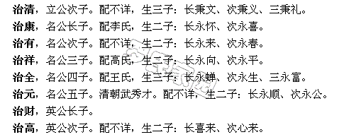 立,安宁长子。配李氏,生二子:长治荣、次治清。