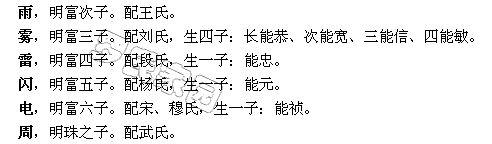 国拴,凤平之子。配氏不详,生一子:富岗。