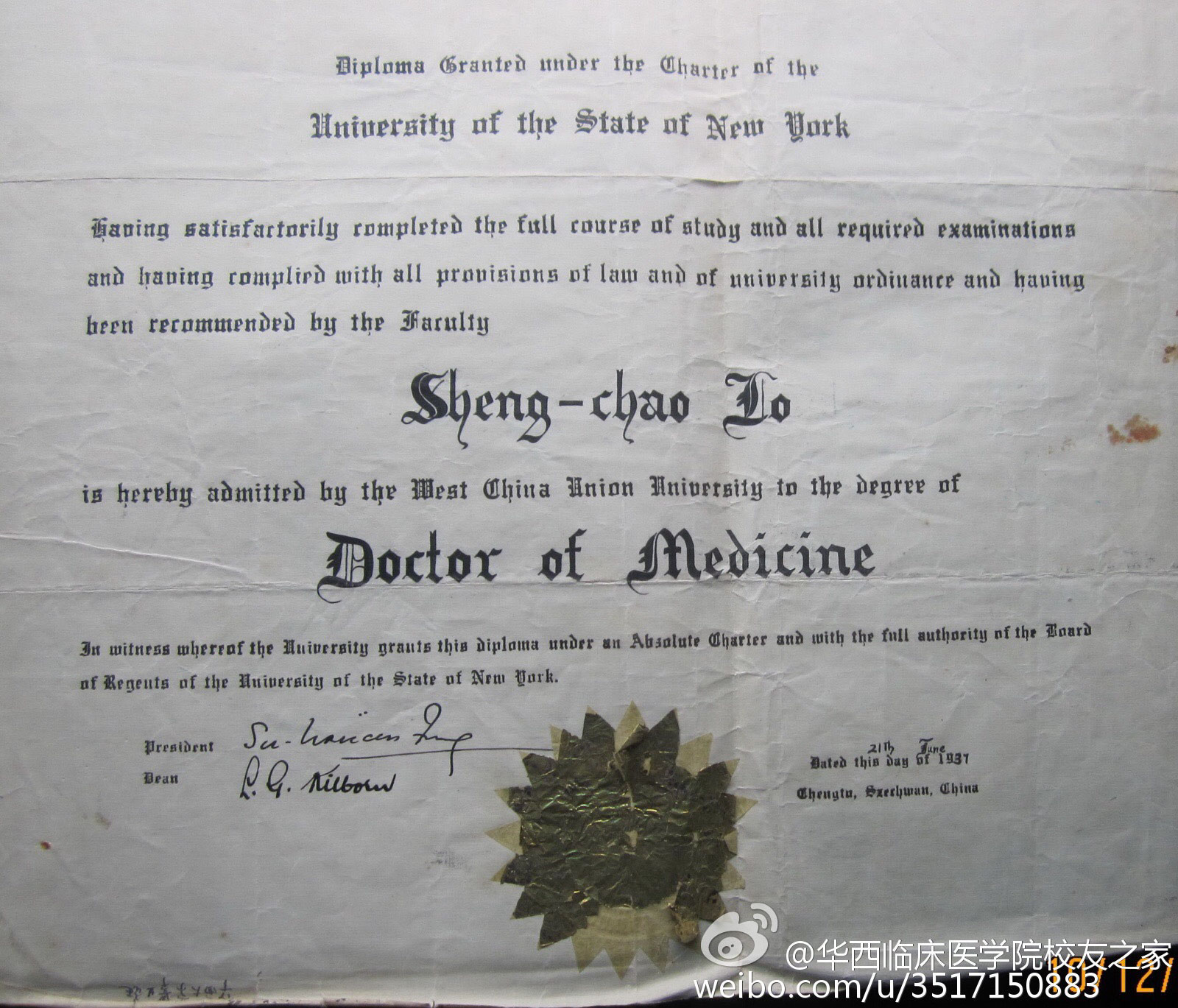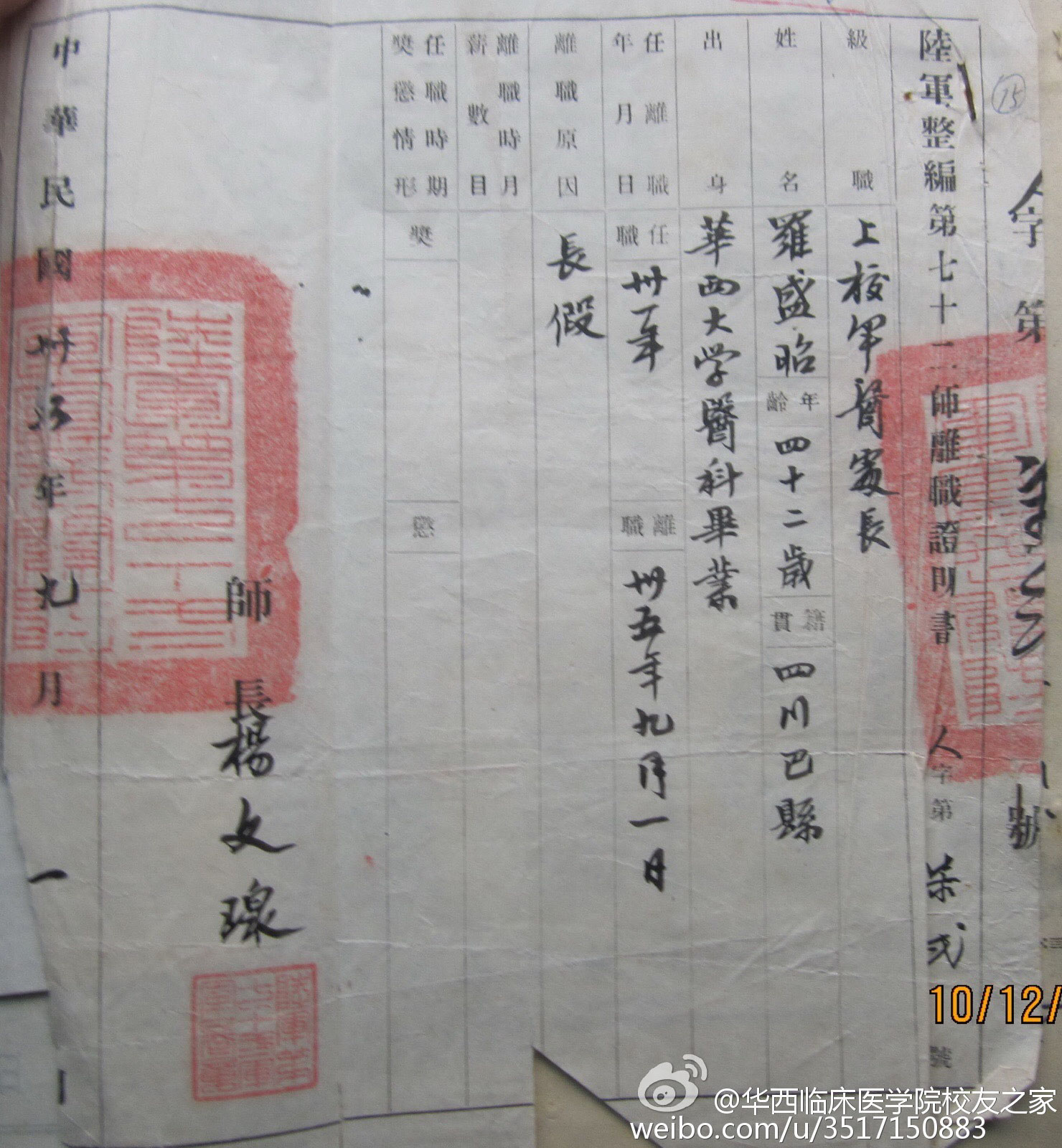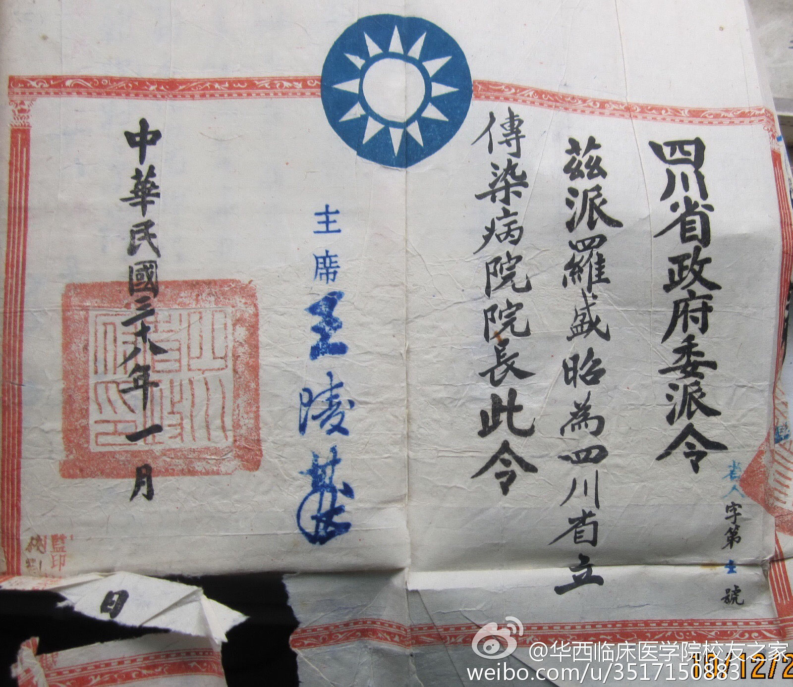 【编者金开泰按】:罗盛昭的事迹校史中有简短记载,90年代校档案馆副馆长孟继兴同志又查到了他给校长的亲笔信,在老华大校刊上也有他报告前线的信件,可惜一直没有找到他的下落。2015年经曹国正帮助,找到了他的外侄女金贵主,金贵和,提供了他的一些情况和照片及最后的单位。经金牛区地方志办公室帮助联系,金牛区卫生局提供了他的相关资料。