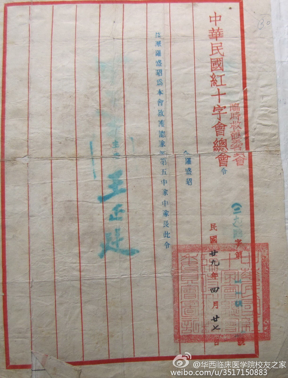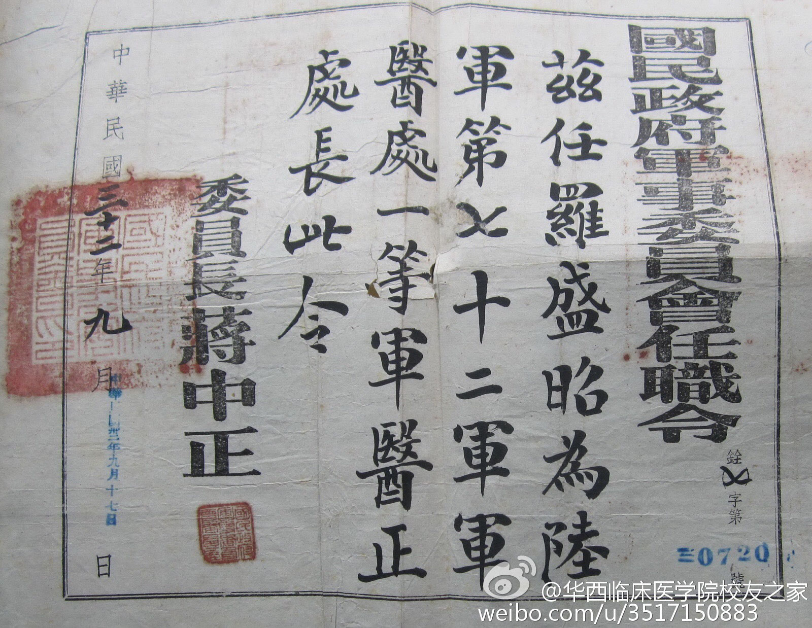 【家园按】:从1942年起,连续三年,四川华西协合大学医、牙科及制药系有100多名应届毕业生应征去军队或军事机关服务,有些还加入远征军的队伍奔赴滇缅前线,1945届毕业的医科学生提前在1944年11月全部应征。1937年就已毕业的罗盛昭,辞去了自己在四圣祠医院的职务,加入中国红十字总会救护委员会救护总队,其后,他受命到各地征集医务人员,组织救护队,并任救护第二大队第十一中队队长。他带领的救护队驰骋数万里,救治受伤军民12万余人。1938年1月27日《大陆晚报》发表社论,赞美罗为“模范医生”。