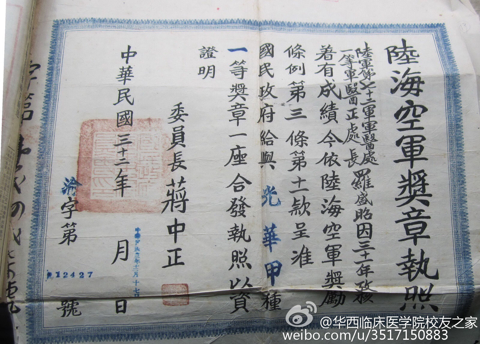 国民政府陆海空军奖章执照(金牛区卫生局供)