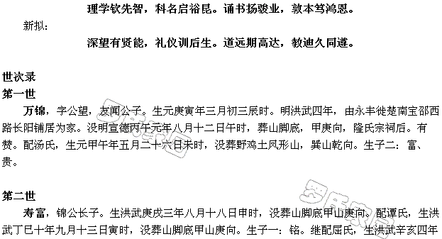 万锦字公望,生元庚寅(据其洪武四年移民邵阳推断,此庚寅应是元顺帝十年即1350年)于明洪武四年辛亥(1371),据其族谱记载,上源世系为:宽淑→先登→天佑→友闻→万锦。然据秀川谱却与此大相径庭:宽淑→先登→天佑→友闻→宜方字实伯、大德、宜中、宜仲兄弟俱徙湖北公安县白湖村,并无一名万锦者。其源流显系寻根心切,胡乱攀附也。
