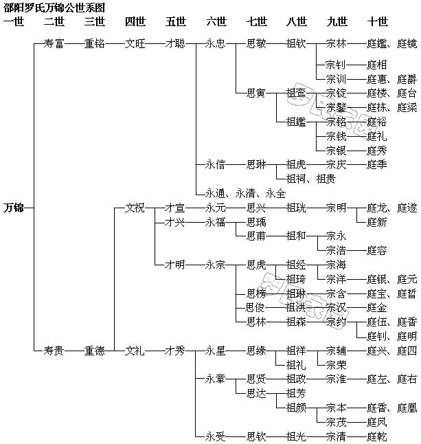 湖南邵阳长烟铺(今长阳铺)罗氏始迁祖万锦公,字公望,本江右永丰人氏。据清光绪卅一年续修族谱,其门出秀川,裔承仲素,父嗣有闻,故而“首列锦公又必推尊闻公”。溯其上源为:
