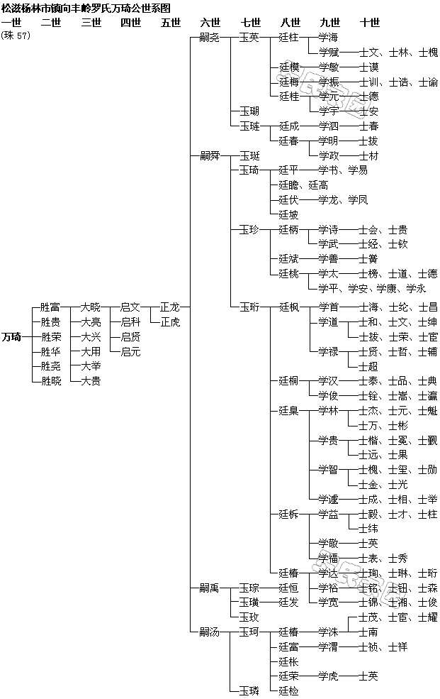 企生(宗伯))→昌(帮)→智通→利祖→景赐→万劝→元锦→世功→志义→尹俊→有光→汉惠→宏信→绍德→廷观→重宣→公璜→叔尹→思恭→振烈→懋芳→定文→殷亮→敬哲→启道→日序→家兴→声誉→美迪→誉坤→恩润→泽贤→长鑫→存春→福铭→寿山→呈仁→祥和→昌海→运来→(57)万琦。