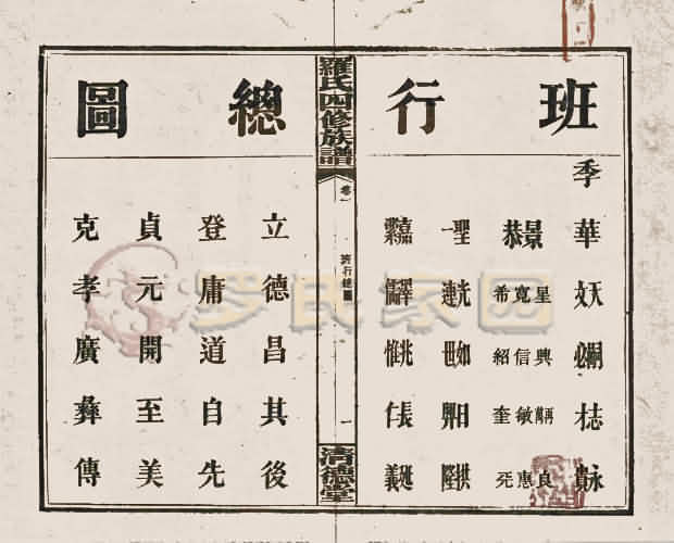 粤自宗法废谱牒兴,士大夫思所以序昭穆辩尊卑而班行作焉。名家巨族,选字琢句,编成韵语,俾子孙世世遵循,罔敢或易不綦重与。我罗氏班行,季华尚矣。迁湘以来,终明之世,垂三百年从未一修家乘。子姓聚族于斯,虽世笃雍睦而无谱以维,击其间萃犹涣也。故命名列班,不相为谋。宴松两公胤则曰“天嗣志永景星与再”,良凤公胤则曰“文必才贵宽信敏惠”,此一九两派之前同而后异也。且松公胤再班有“万”字之异,凤公胤“宽信敏惠”四班有“希绍奎天”四字之异,此又各派之自相异同也。泊含章公创修家谱,续立班行,始归画一,此一九两派之既异而复同也。若必华公支恭时公于明成化间迁居衡邑金兰一都,三传至敏呈公又转徒永伏乡,即今斗石,自他有耀各自为谱,历四百有余岁,班行亦因之而殊。今兹收缩合修对勘互校,此曰“圣光如日拱”,彼曰“一连世兴隆”,此曰“嘉泽兆长延”,彼曰“绍儒惟仁义”。此更最后之异而不同者也。迺以代远年湮不能更正,壹是谨缩小字画双行刻刊,道并行而不悖也。至兴隆之“兴”与兴再之“兴”,绍儒之“绍”与绍奎之“绍”同,仍依老谱。因奎天之“天”同天嗣之“天”概以卑避尊,权写本字古文以别之。虽然班行不可轻易,含章公尝三致意焉,后之人其永守斯图而弗替乎。顾图内参伍错综,阅者茫然,爰作班行图说,俾后世嘹然于异同之辩也。